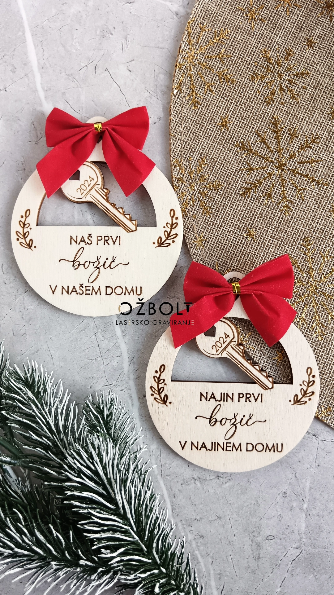 Lesen božični okrasek, z vgraviranim napisom po izbiri in rdečo mašnico.