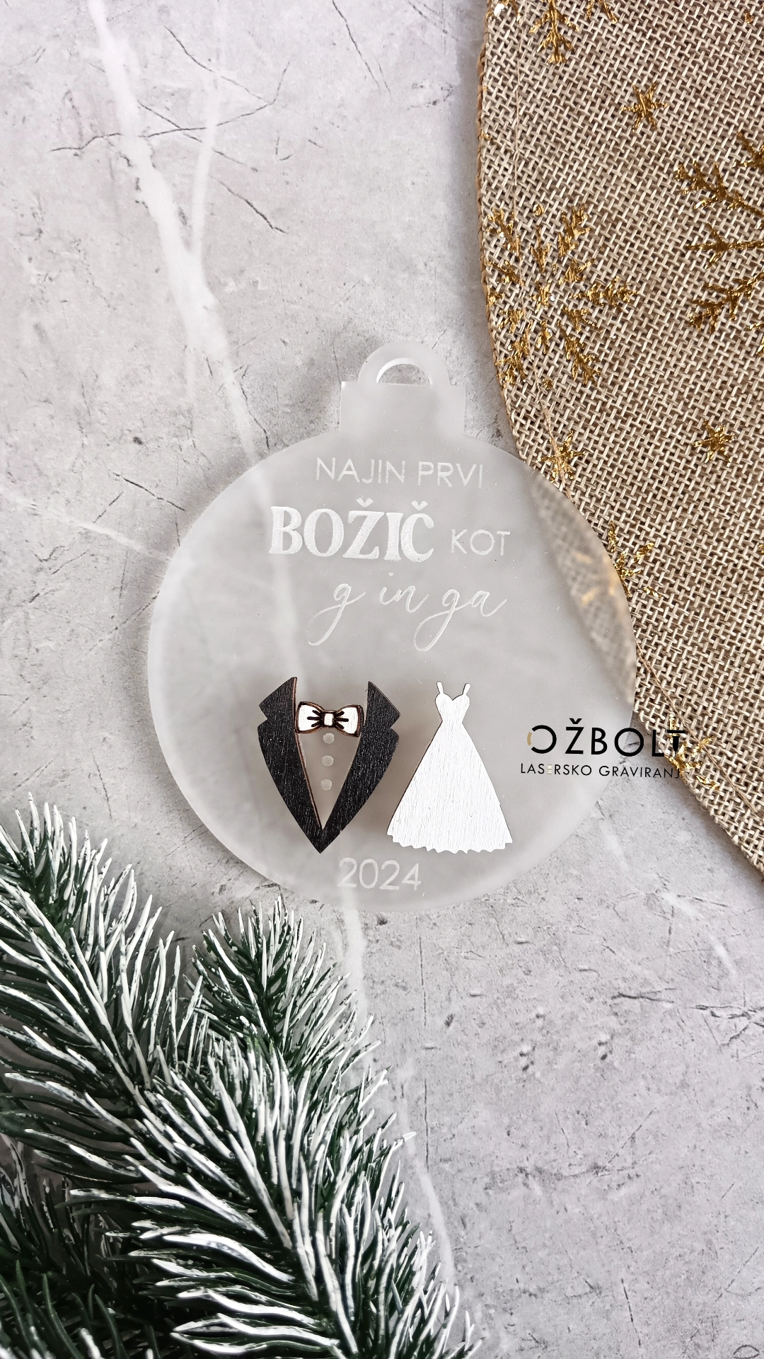 Božični okrasek za mladoporočence z lesa in akrilnega stekla, z vgraviranim napisom.