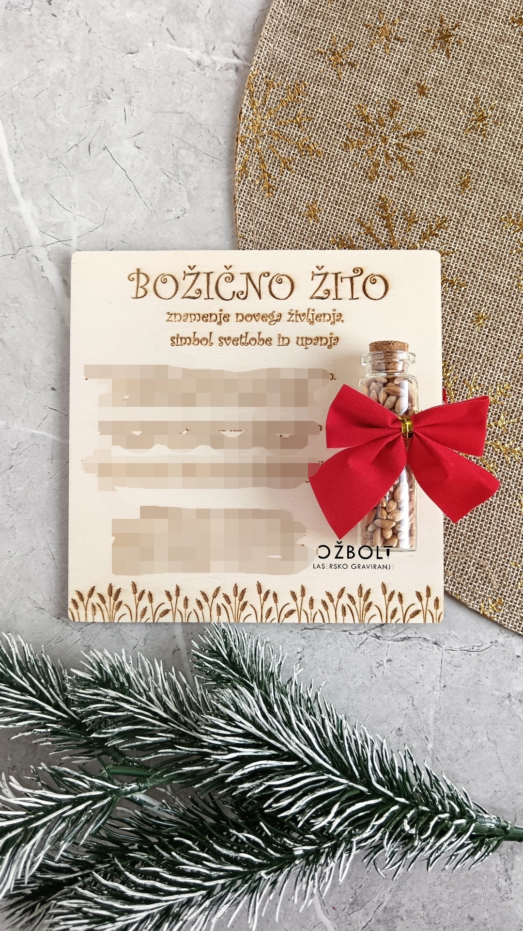 Lesena tablica z navodili za setev božičnega žita vsebuje navodila ter žito.
