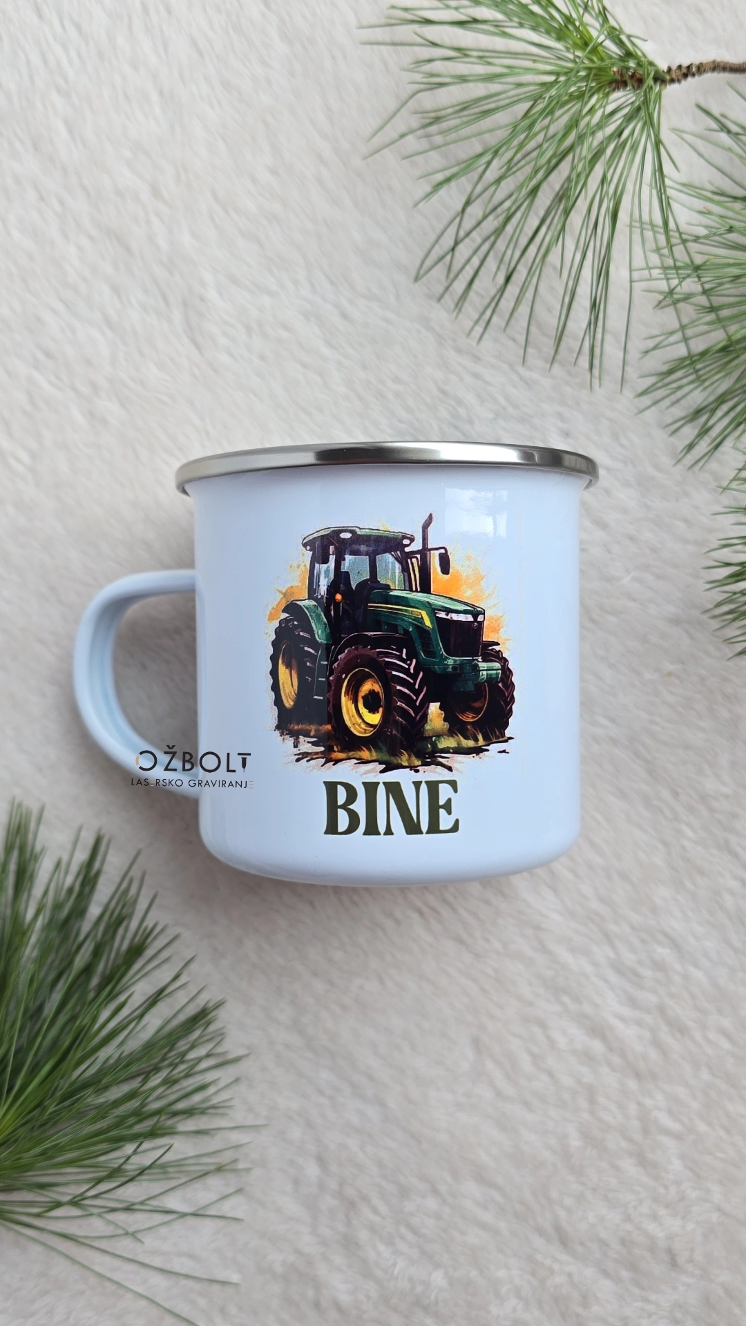 Emajlirana skodelica bele barve s srebrnim robom, z potiskom in prostornino 350ml. Primerna za pranje v pomivalnem stroju.
