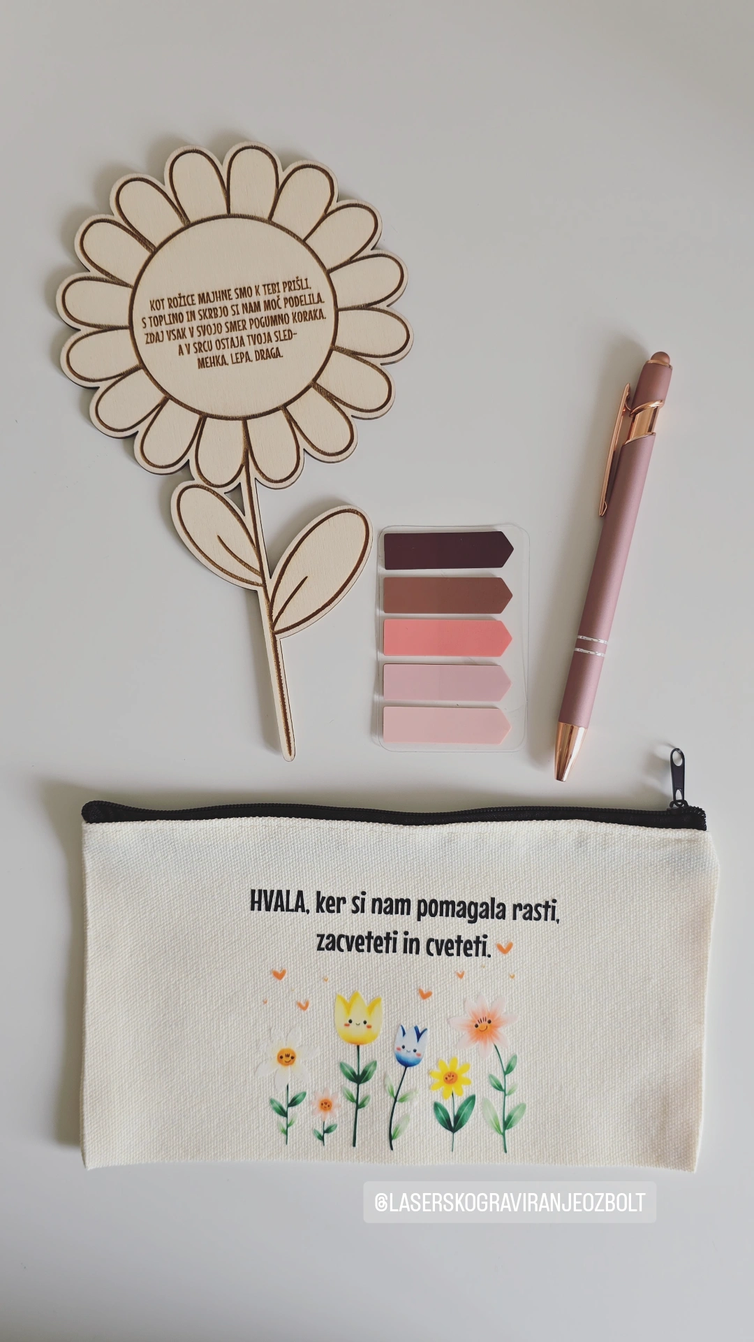Komplet vsebuje: – samolepilno kazalo – kemični svinčnik – toaletka z potiskom – lesena rožica z posvetilom