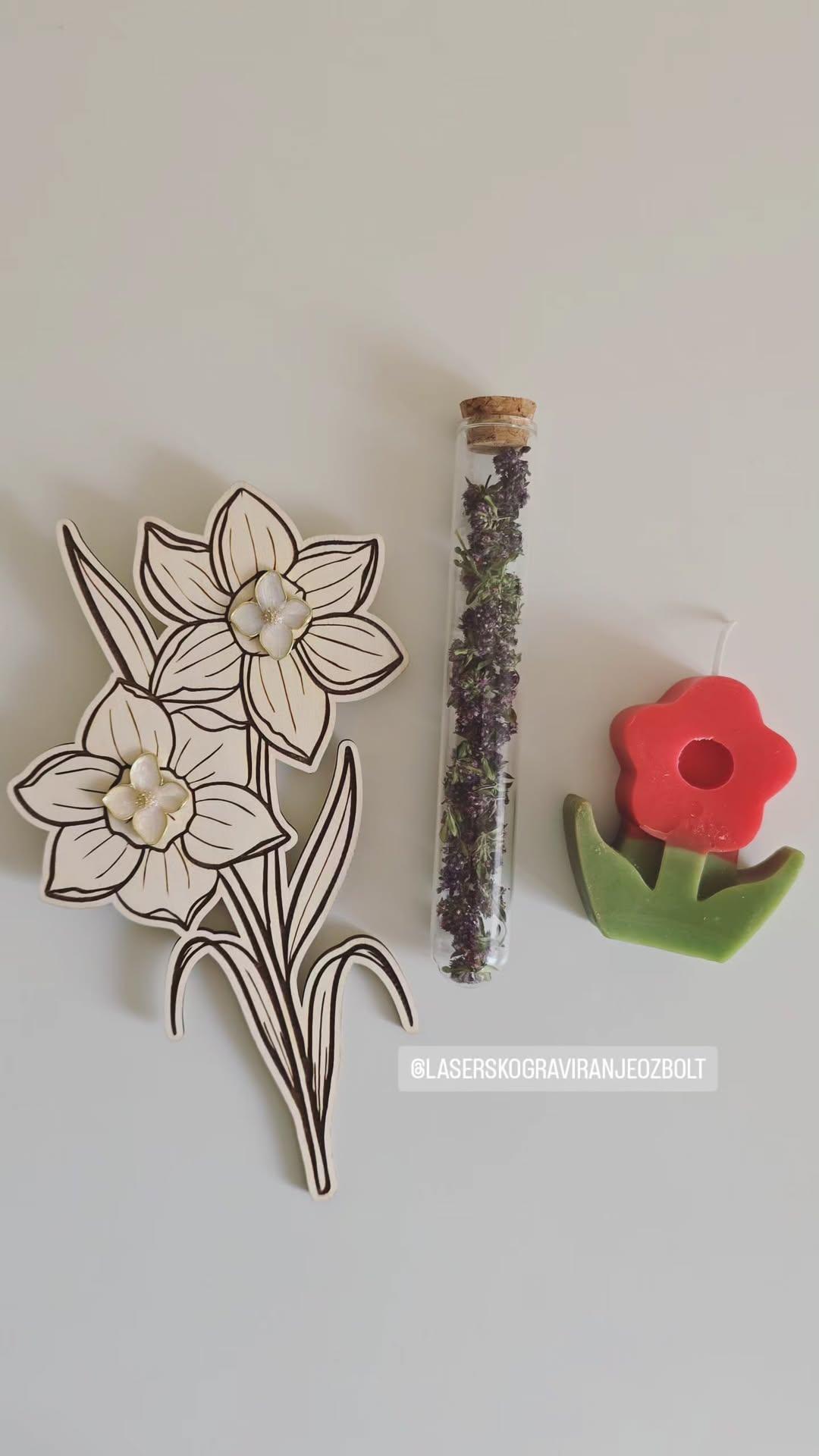 Komplet vsebuje: – dišeča svečka v obliki rožice – eprveta z posušeno materino dušico – leseno rožico z uhani