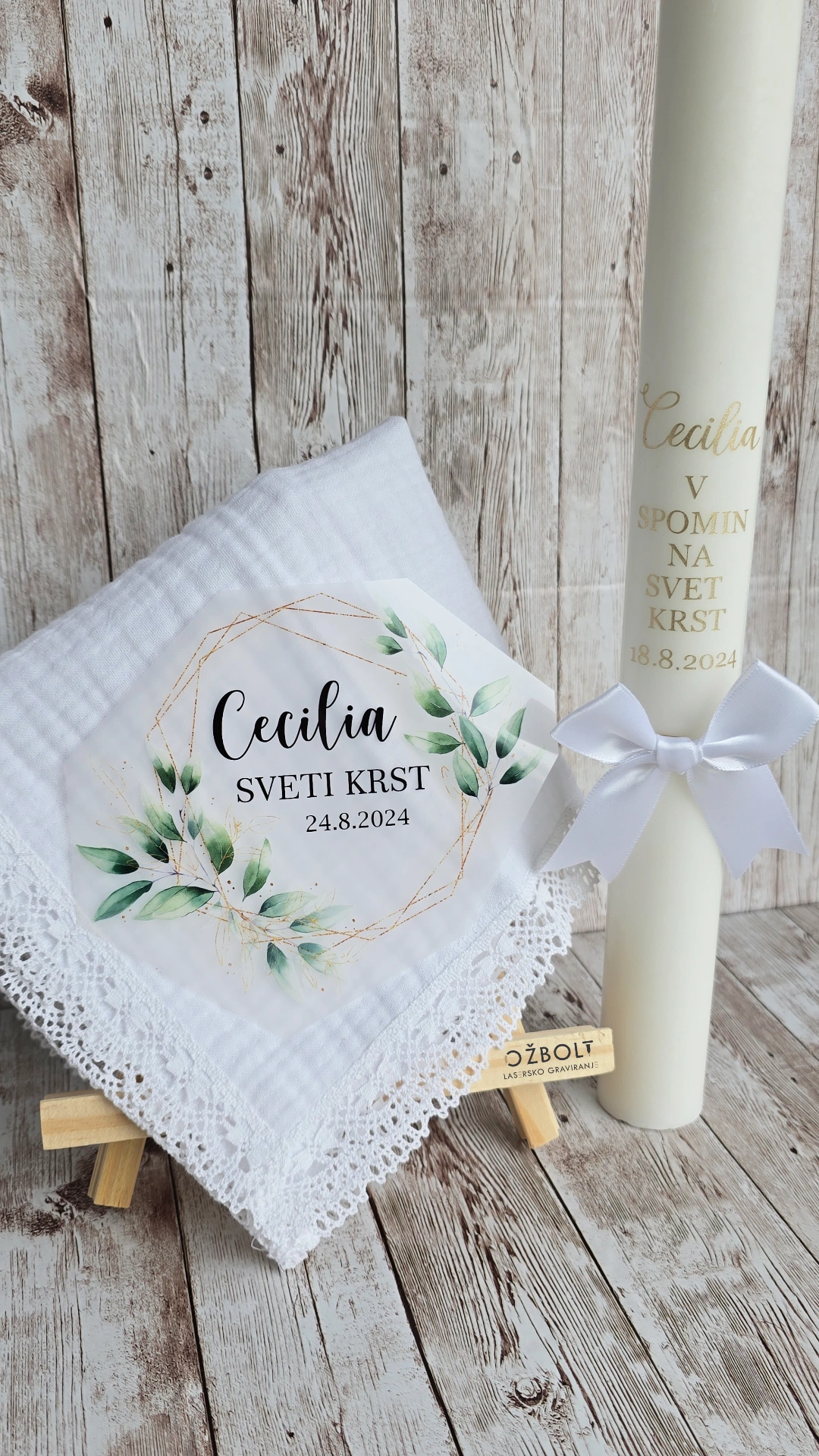 Krstni komplet vsebuje krstno svečo in prtiček.