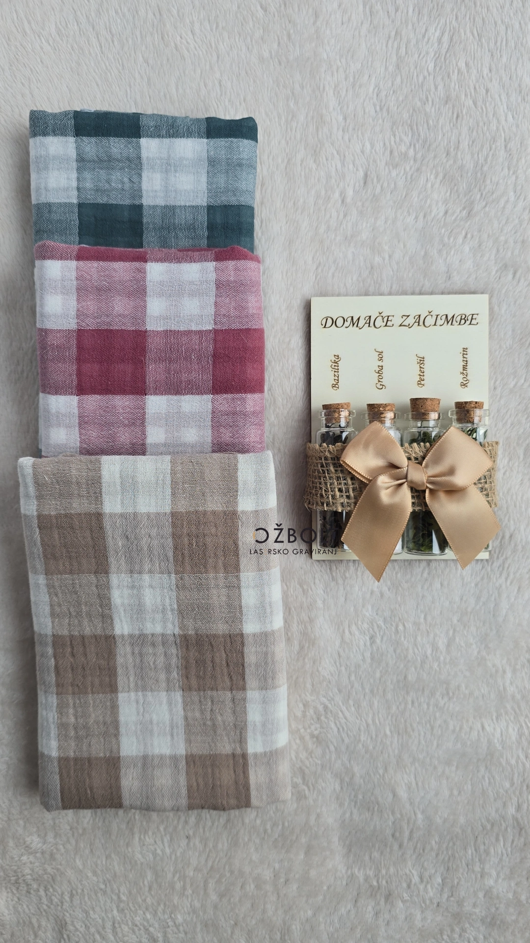 Izjemno vpojne in nežne kuhinjske krpe iz tetra materiala, sestavljene iz 4 plasti, za še boljšo trpežnost in učinkovitost ter odlično vpojnostjo. Vsaka krpa je ročno šivana, zato je vsak izdelek edinstven in narejen z veliko mero natančnosti. So mehke, lahke in hitro sušeče. Primerne so za kuhinjo, brisanje posode, pulta, rok… Pri prvem pranju se nagubajo in malenkost skrčijo. Priporočeno je pranje na 40°C. Dimenzija 50x30cm. V kompletu so 3 krpe različnih barv in posušene domače začimbe.