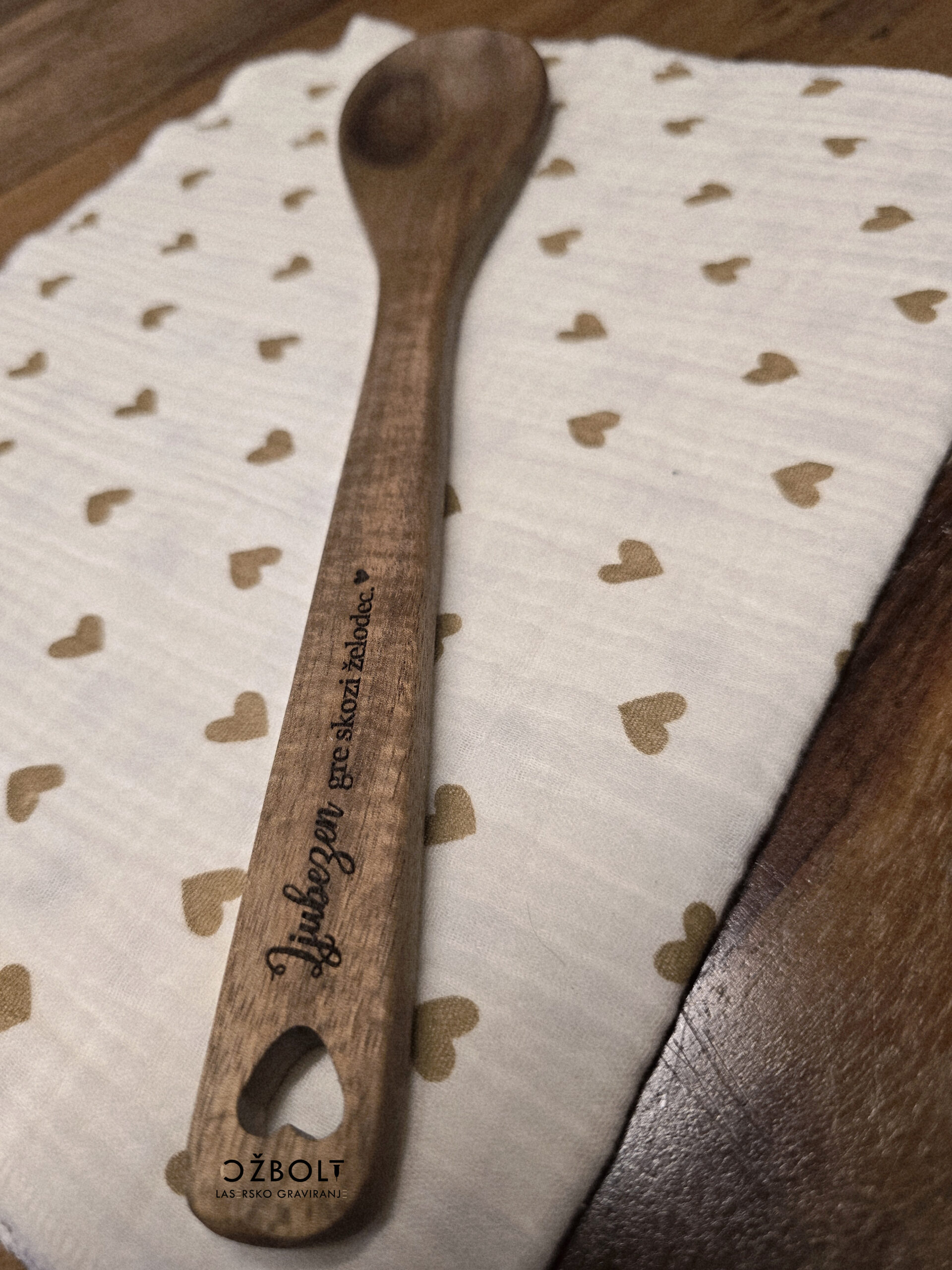 Komplet vsebuje kuhinjsko krpo in leseno kuhalnico z gravuro.
