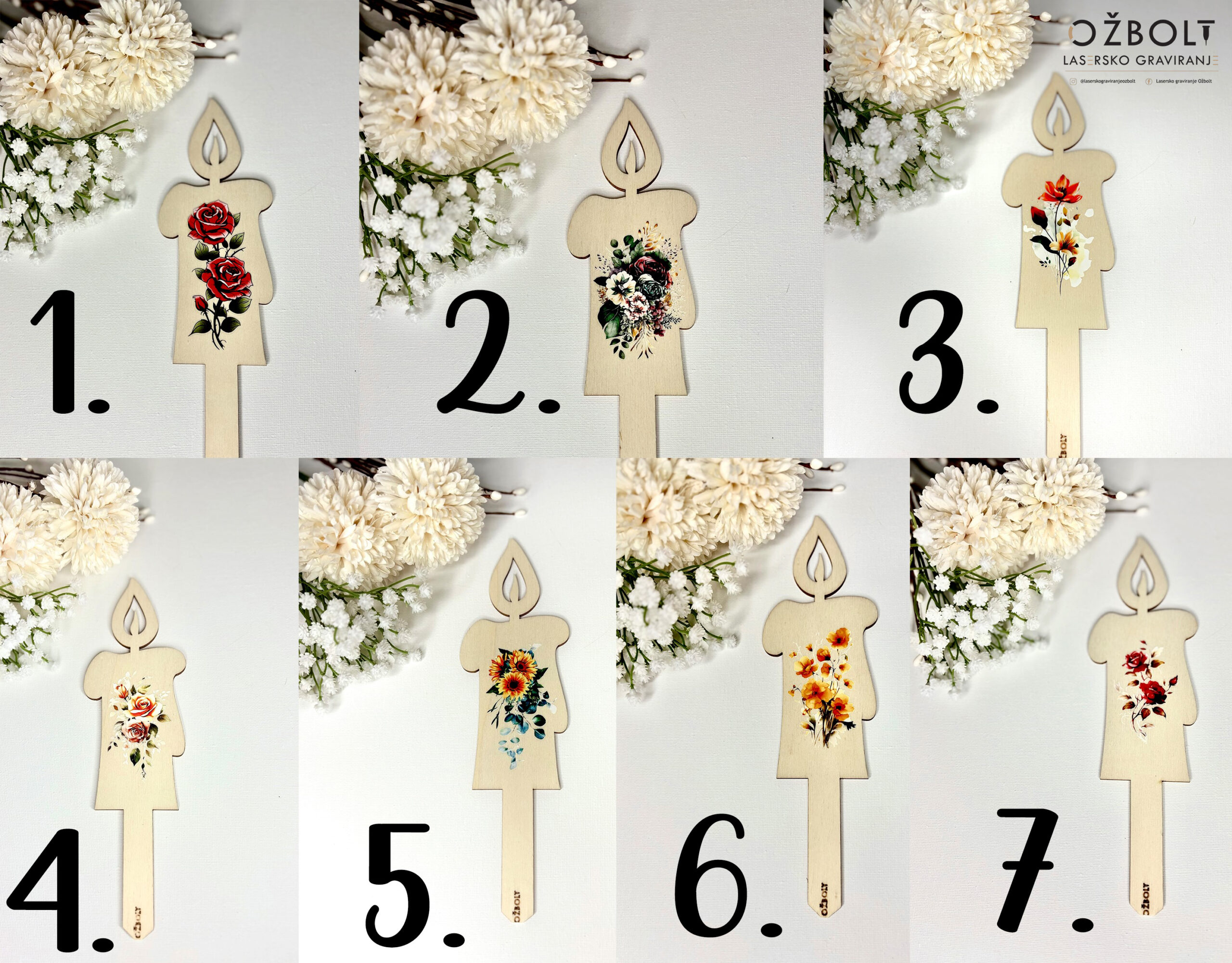 Lesena svečka je izdelana iz lesa in barvno tiskana. Primerna je za zapik v zemljo, pesek, vazo ali ikebano. Je popolnoma razgradljiva. Na prostem zdrži od 6-8 mesecev.