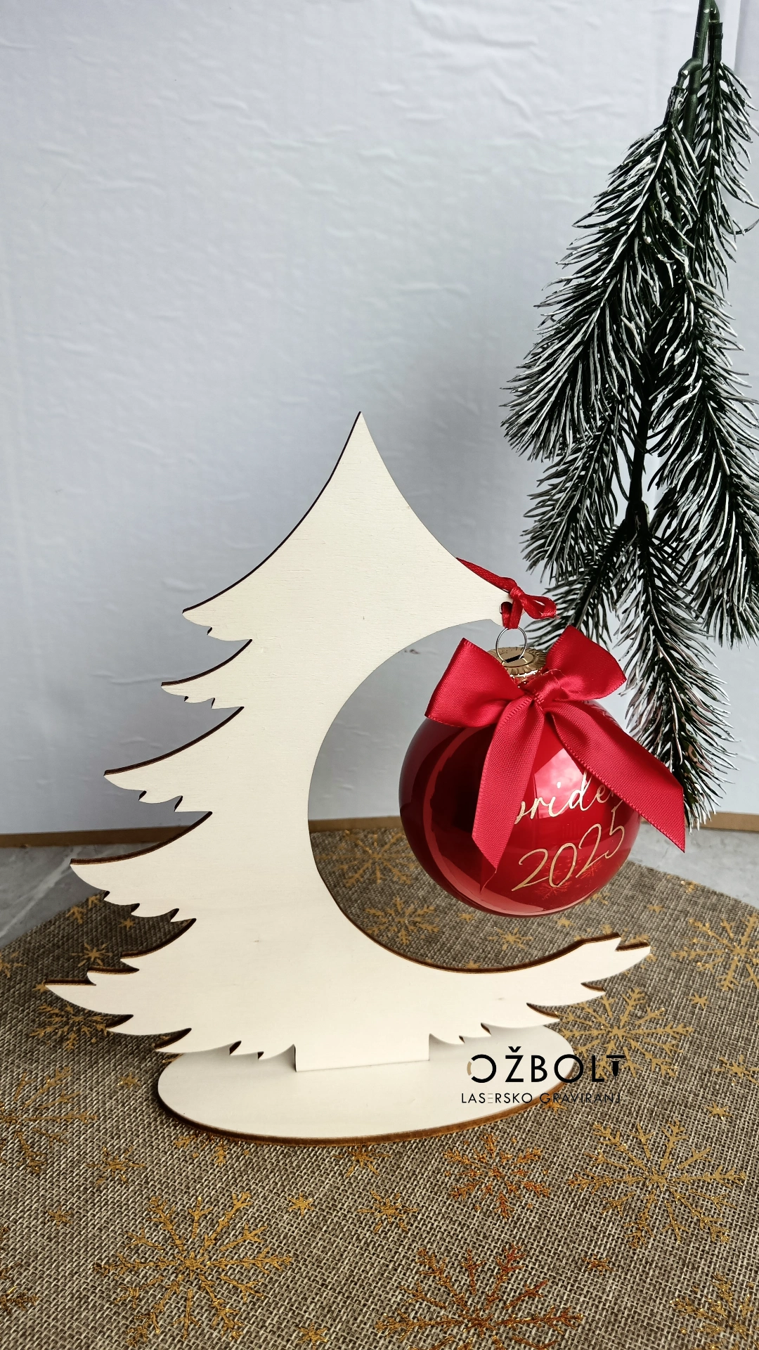 Božična lesena smreka z prostorom za viseč božični okrasek do premera 10cm. Smrekica vsebuje tudi podstavek.