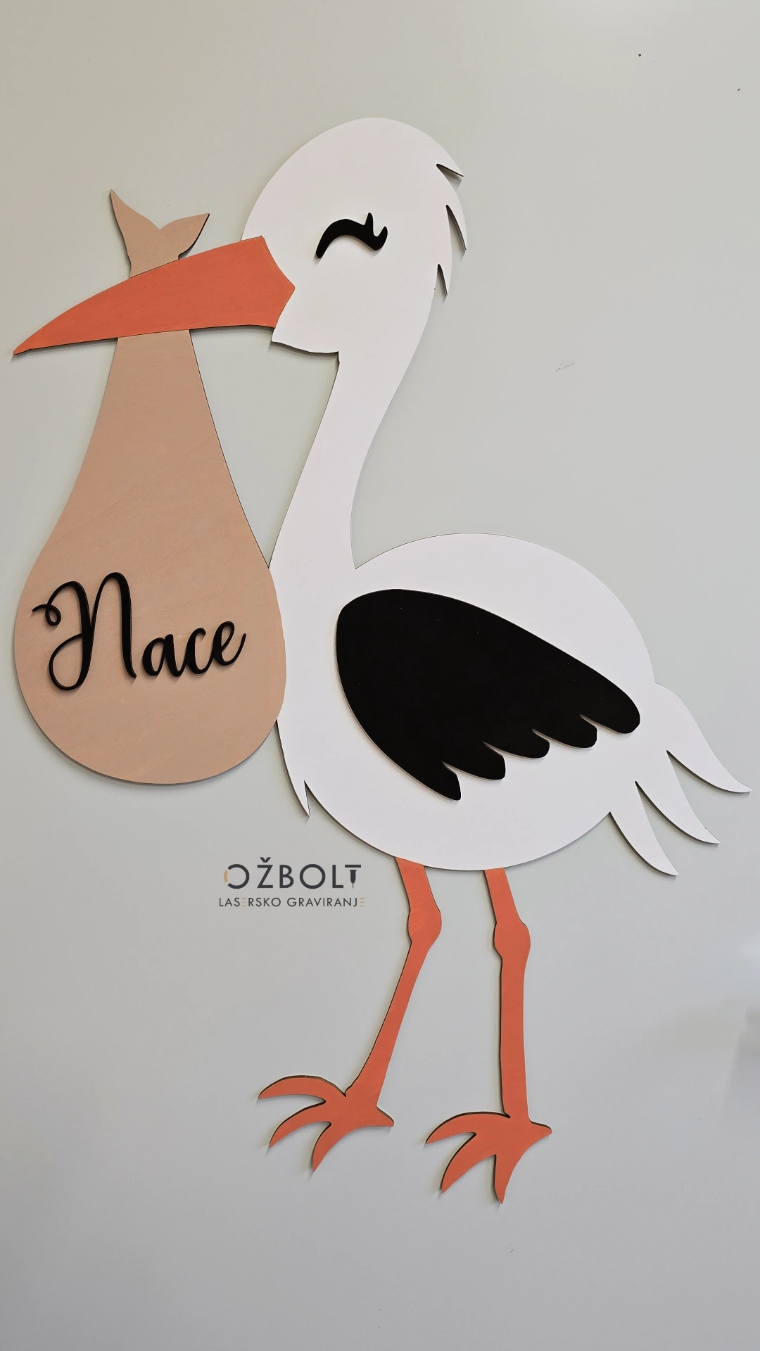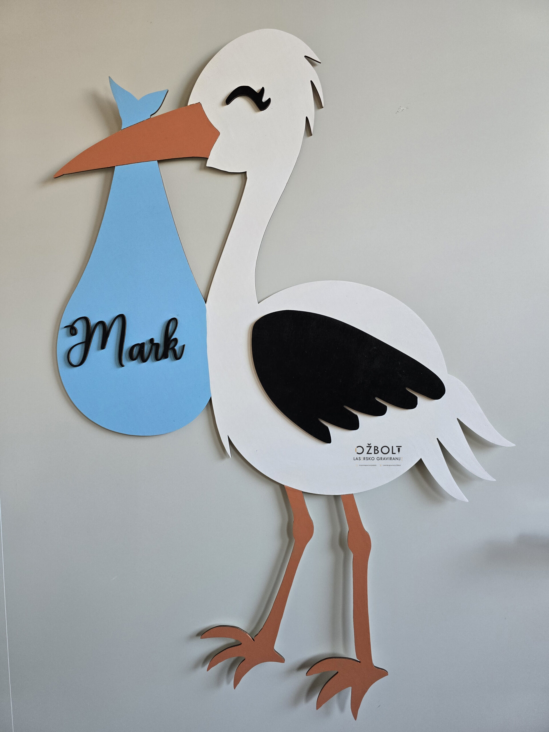 Lesena štorklja ob rojstvu otroka z modro, roza ali bež vrečo in črnim napisom (željeno barvo napiši v opombe).