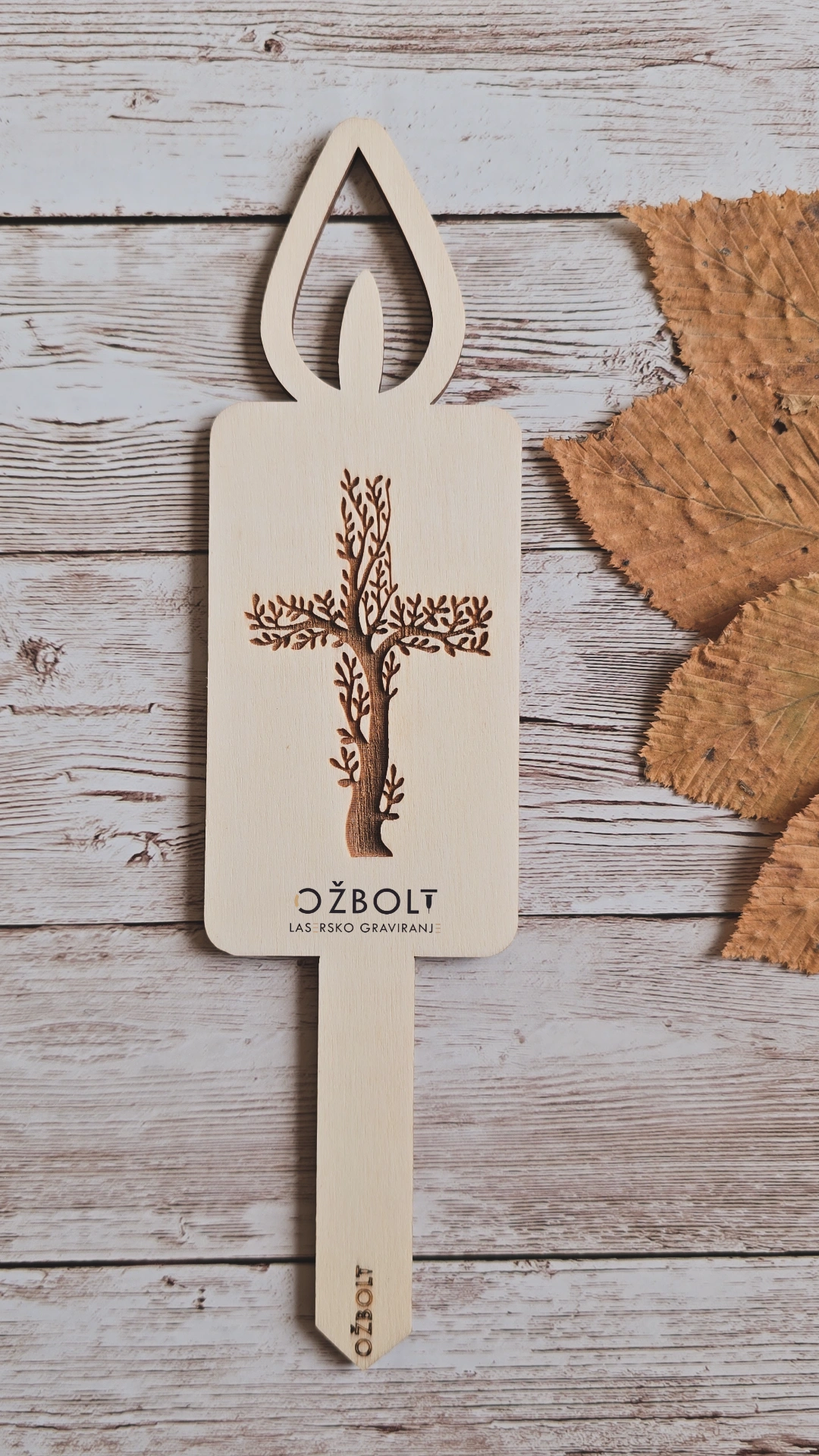 Lesena svečka je izdelana iz lesa in gravirana. Primerna je za zapik v zemljo, pesek, vazo ali ikebano. Je popolnoma razgradljiva. Na prostem zdrži od 6-8 mesecev.