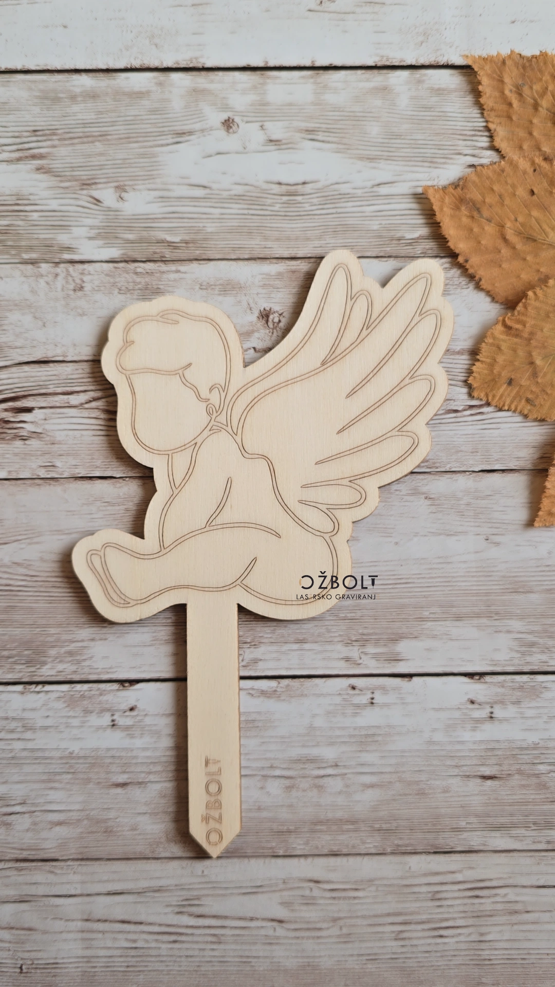 Lesena svečka je izdelana iz lesa in gravirana. Primerna je za zapik v zemljo, pesek, vazo ali ikebano. Je popolnoma razgradljiva. Na prostem zdrži od 6-8 mesecev.