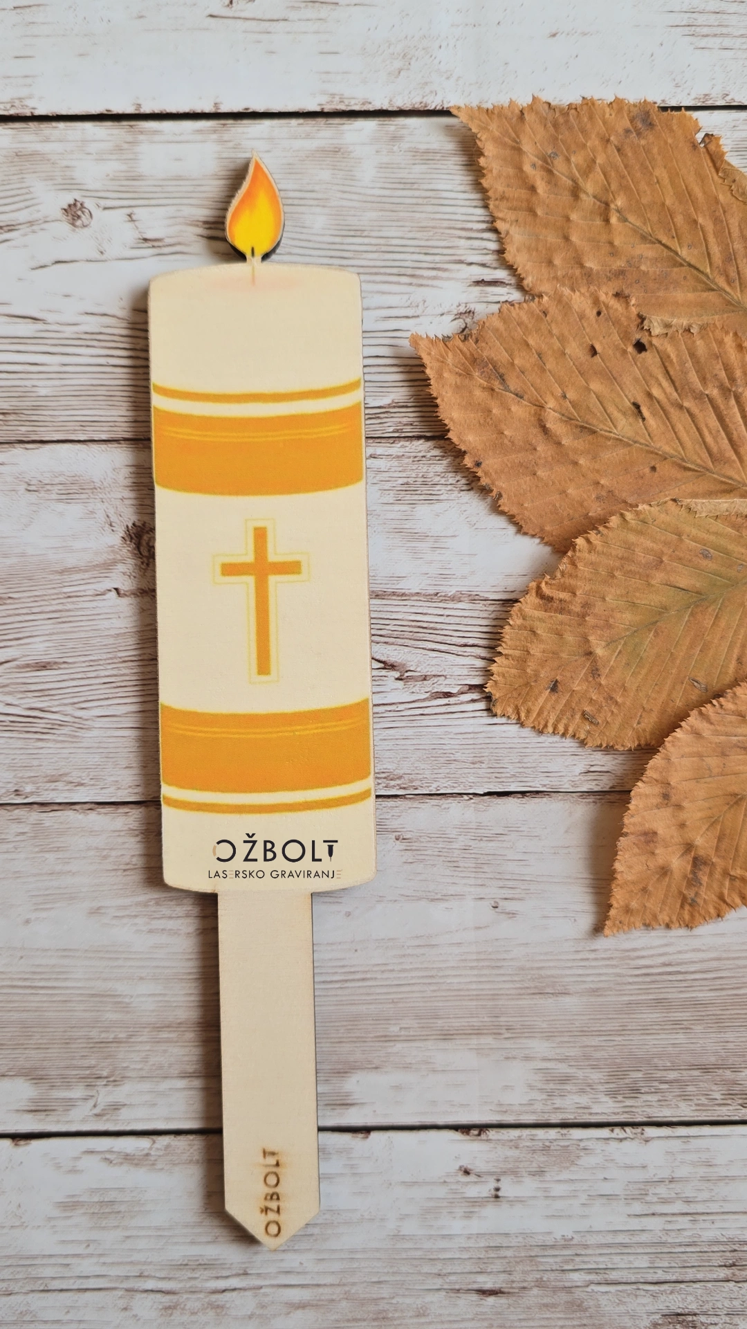 Lesena svečka je izdelana iz lesa in potiskana z barvami. Primerna je za zapik v zemljo, pesek, vazo ali ikebano. Je popolnoma razgradljiva. Na prostem zdrži od 6-8 mesecev.