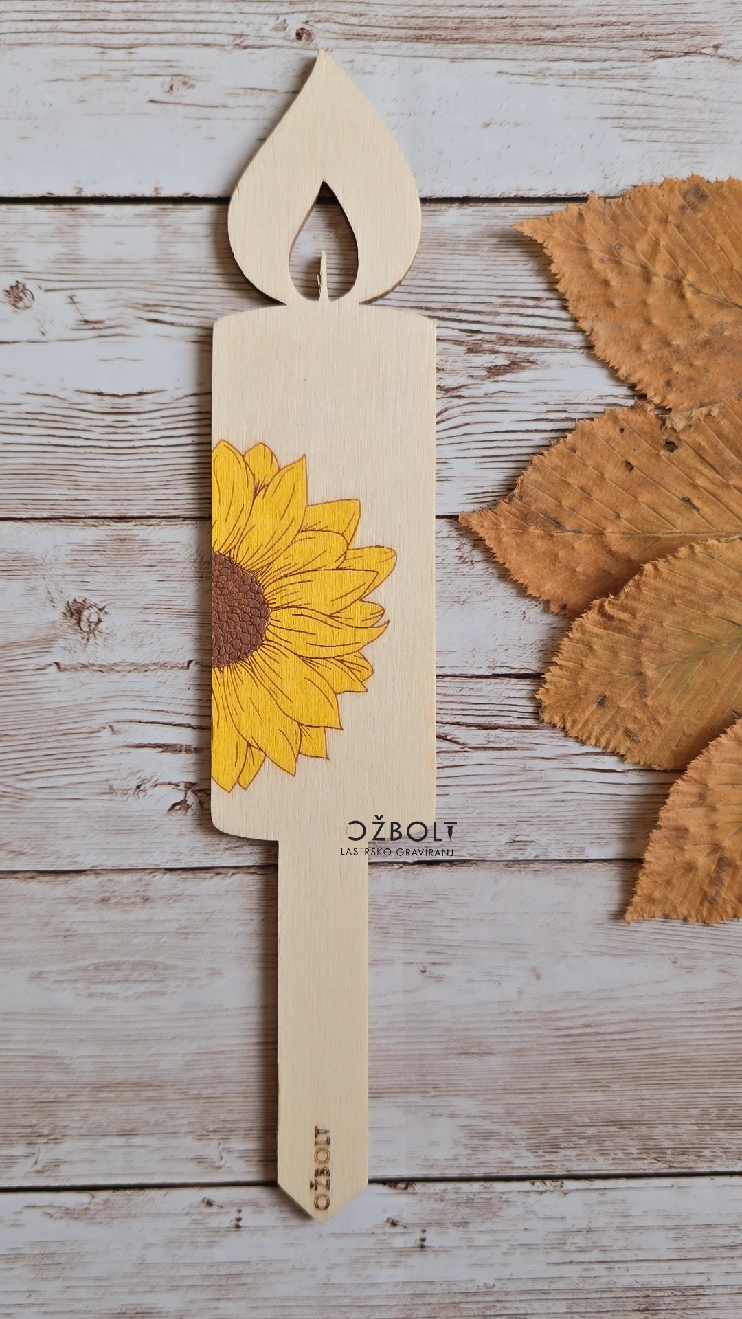 Lesena svečka je izdelana iz lesa, gravirana in ročno barvana. Primerna je za zapik v zemljo, pesek, vazo ali ikebano. Je popolnoma razgradljiva. Na prostem zdrži od 6-8 mesecev.