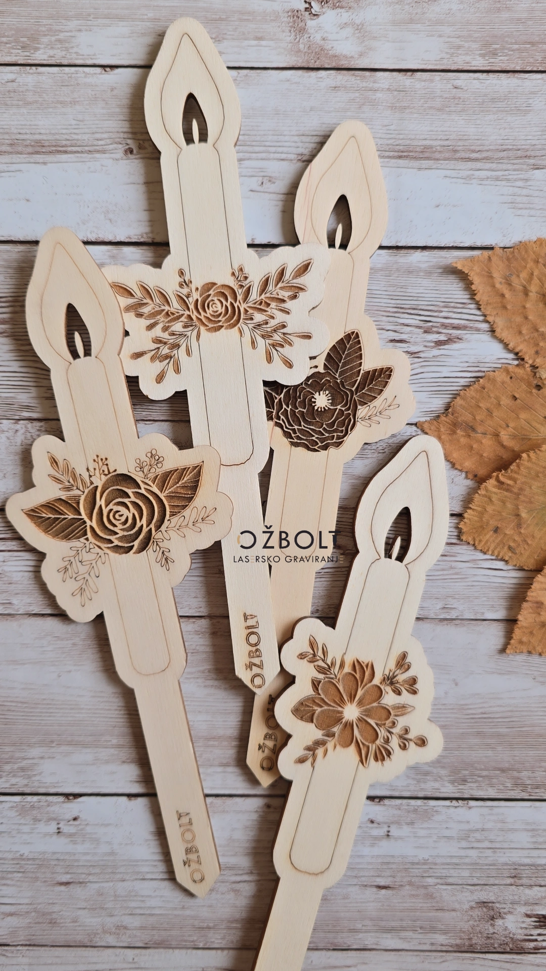 Lesena svečka je izdelana iz lesa in gravirana. Primerna je za zapik v zemljo, pesek, vazo ali ikebano. Je popolnoma razgradljiva. Na prostem zdrži od 6-8 mesecev. Cena velja za 1kom.