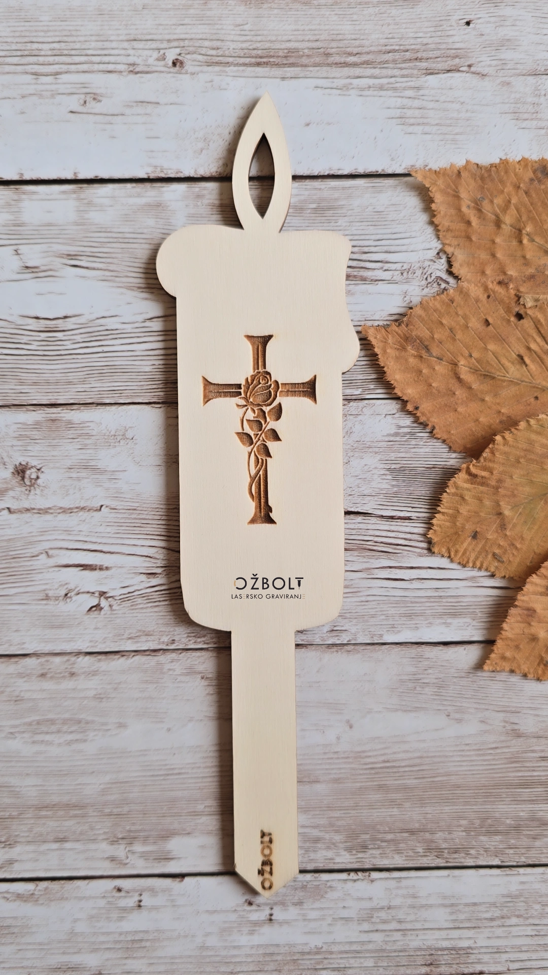 Lesena svečka je izdelana iz lesa in gravirana. Primerna je za zapik v zemljo, pesek, vazo ali ikebano. Je popolnoma razgradljiva. Na prostem zdrži od 6-8 mesecev.