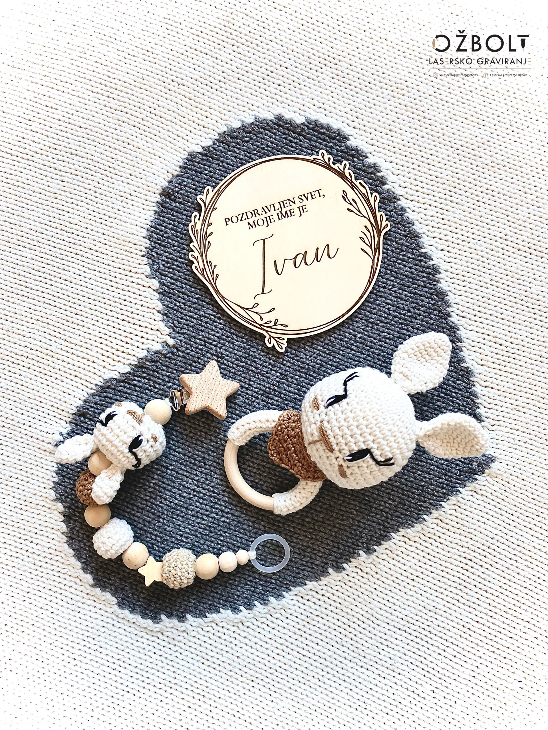 Paketek vsebuje kvačkano ropotuljico, kvačkano priponko za dudico in oznanitveno tablico z imenom. Ropotuljice so delane ročno v Sloveniji, zato je čas dobave 5-7 delavnih dni. Vsak izdelek je unikat!