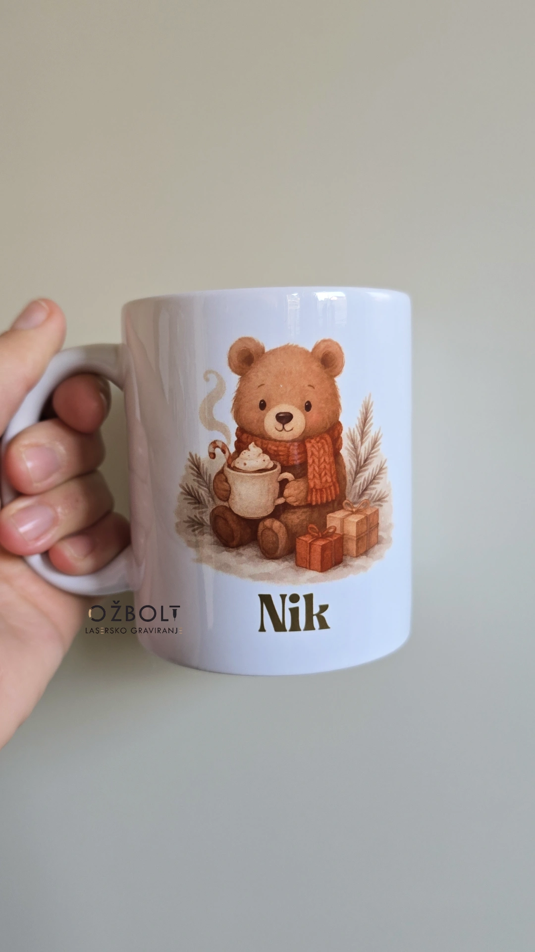 Skodelica bele barve z potiskom in prostornino 325ml. Primerna za pranje v pomivalnem stroju.