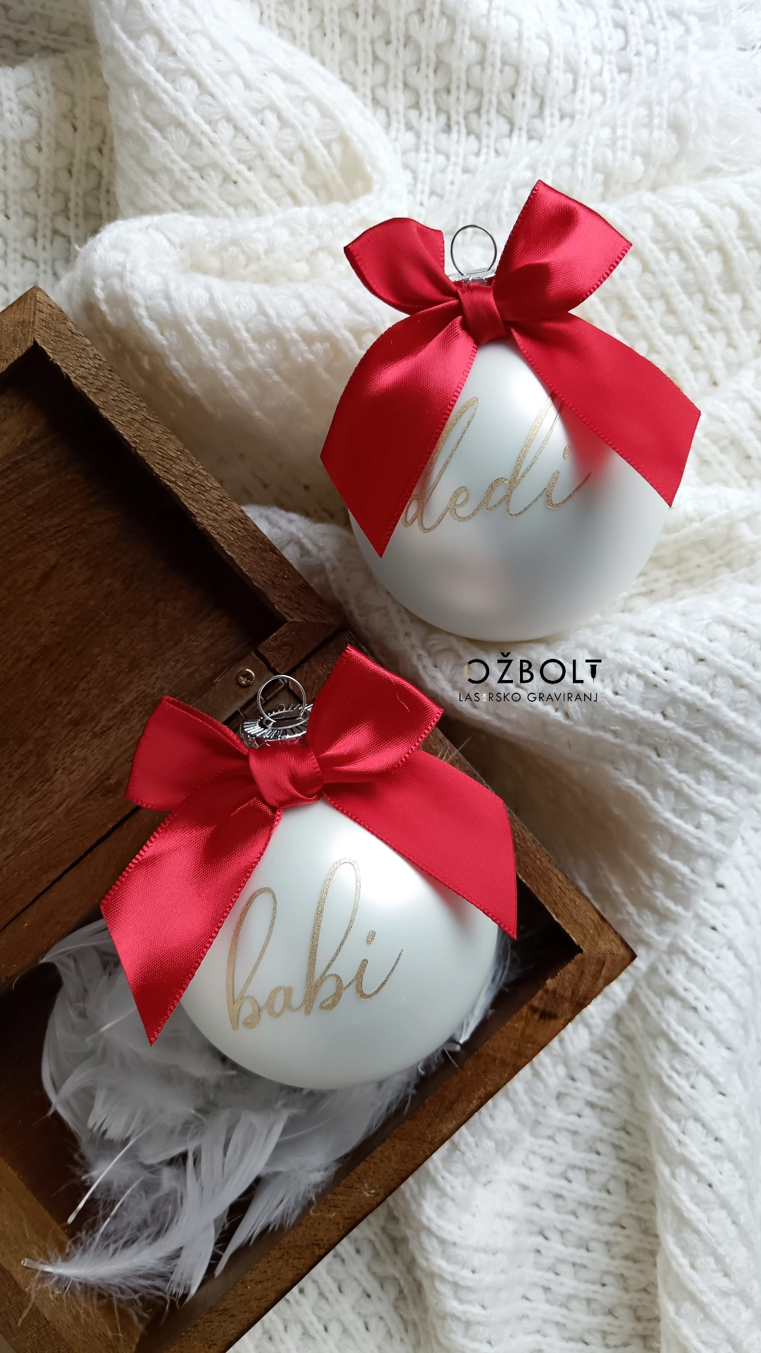 Personalizirana kroglica iz stekla v mat beli barvi, z rdečo mašnico in zlatim napisom po izbiri.