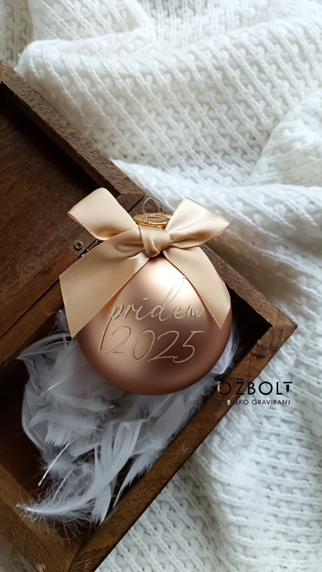 Personalizirana kroglica iz stekla v mat bronz barvi, z zlato mašnico in zlatim napisom po izbiri.
